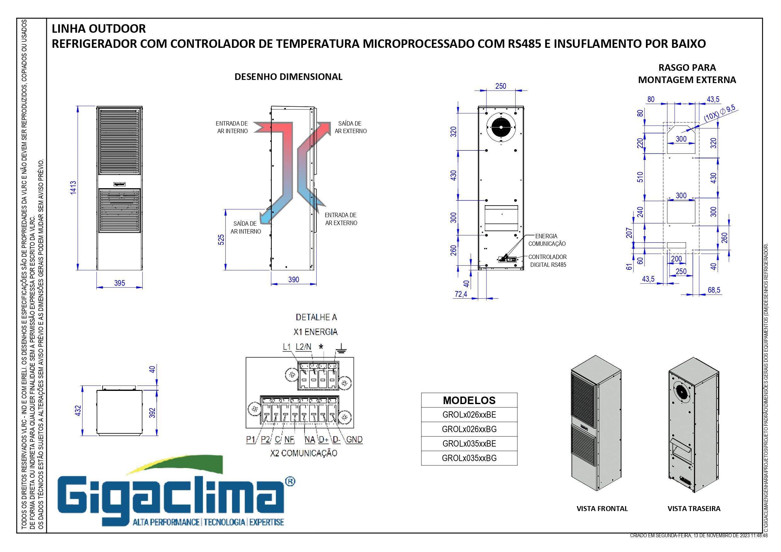 | Proteção (curva C): 10A | Dimensão (H x C x P): 1413 x 395 x 432mm |